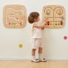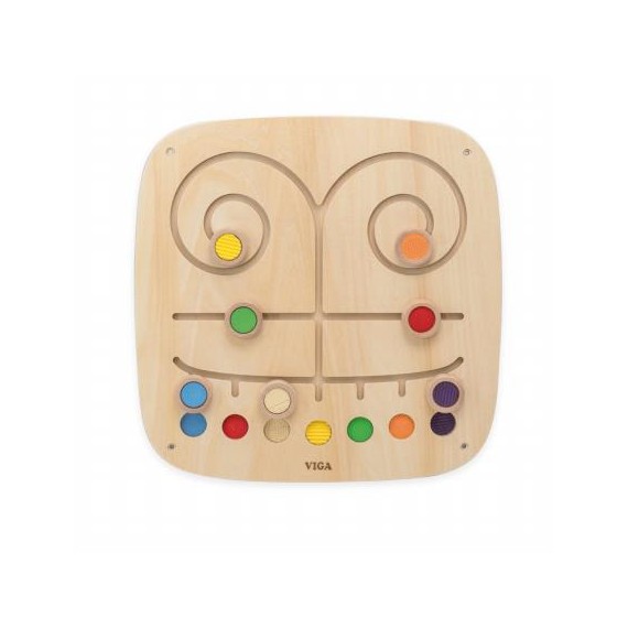 Le panneau mural comporte 7 éléments aux textures et couleurs uniques que le tout-petit peut faire glisser dans le labyrinthe en essayant de les associer.