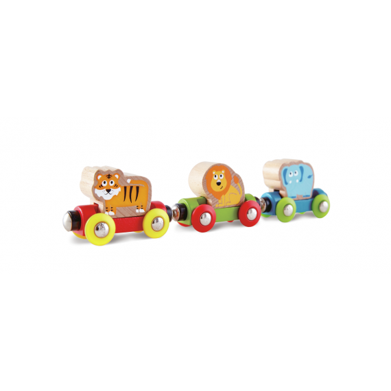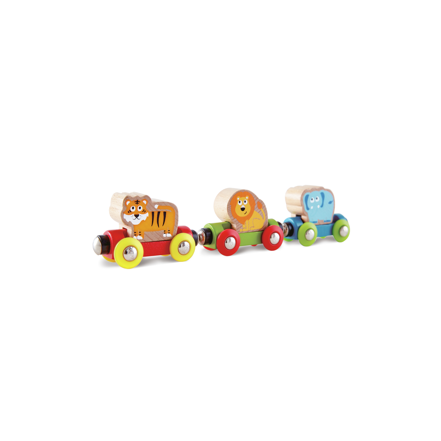 * Dimensions : 6 pièces dont 3 wagons et 3 animaux de la jungle en bois.